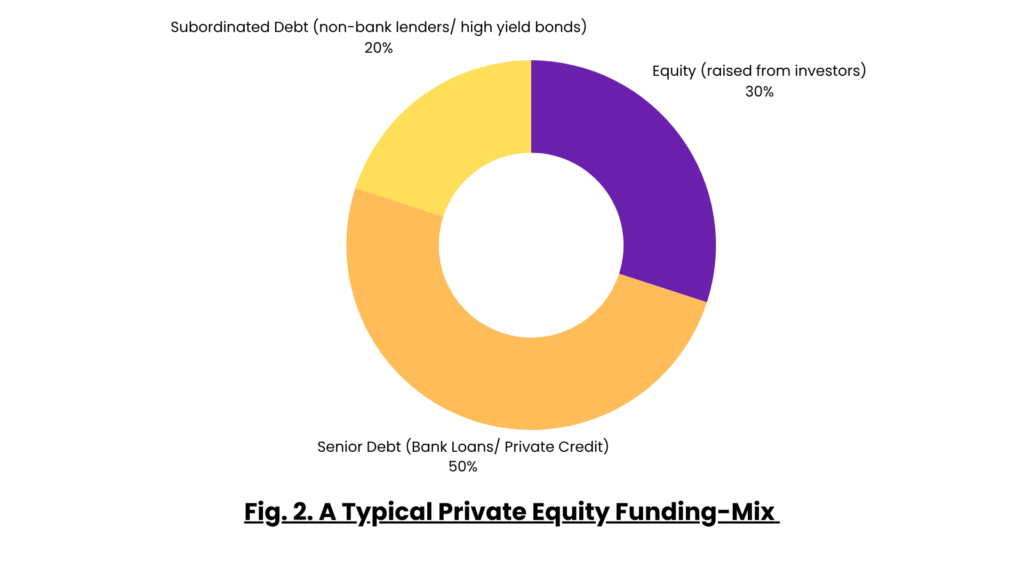 The preferred mix of funding-sources depends, in large part, on the nature and incentives of the acquirer. Strategic acquirers (i.e., businesses that acquire other businesses to expand/ enhance their own operations) need to look out for things like their credit ratings and leverage on their books while financial acquirers/ private equity acquirers (i.e., entities that acquire companies as investments, to generate returns) (we’re gonna use both terms interchangeably since private equity happens to be the most dominant form of financial investment of our time) rely mainly on debt. Regardless of the nature of the transaction, as you’ll see below, debt availed from banks plays a crucial role.