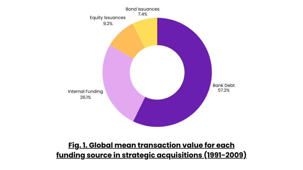 Empirical data agrees with the above hierarchy of preferences. A study examining 610 strategic takeovers across the world from 1991 and 2009 found that an average of ~57% of the transaction value was funded by bank-loans and more than 25% of the takeovers used bank loans as the sole source of financing. Internal funds accounted for a mean value of ~26%, equity issuances for 9.21%, and bond issuances for 7.47% (see fig. 1 above).